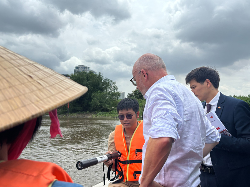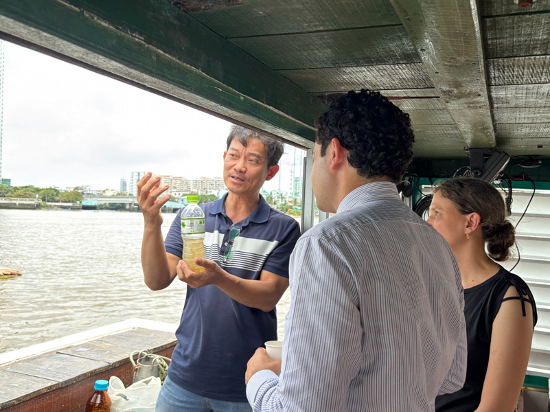 Discussions focused on key issues such as land subsidence and coastal erosion in the Mekong Delta, river dynamics, and surface water quality. During the field trip, water sampling and in-situ measurements were carried out on the Saigon River, demonstrating the long-term water quality monitoring program implemented by CARE researchers.